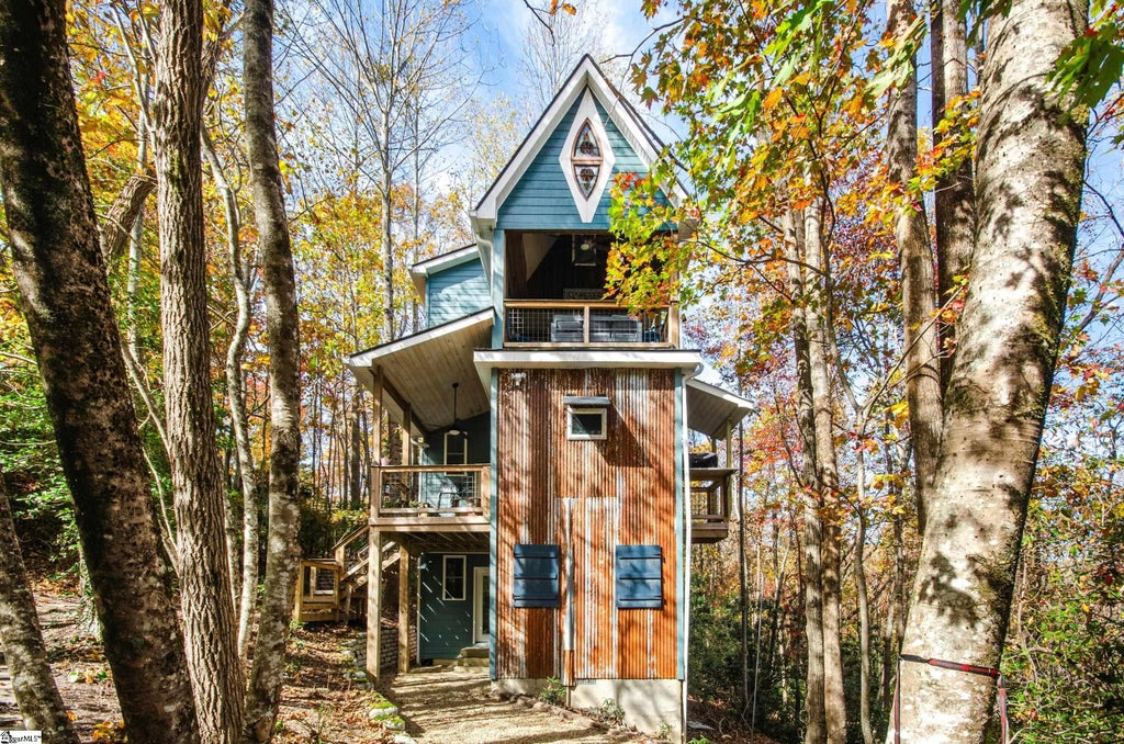 Welcome to 5 Sunrise Dr in the historic Caesar’s Head Community. You may think this home should have been featured on HGTV’s "Treehouse Masters". It’s certainly no treehouse, but it lives very fun and screams “getaway”, smack dab in the middle of the trees with wintertime views. Built in 2024, this home features 2BR and 2.5BA. The exterior is a blend of hardiplank and corrugated metal. Bottom level - master bedroom and bath. Second level - living room and kitchen, porch and grilling balcony. Third level - office/den, covered porch, half bath. Fourth floor/attic - second bedroom and full bath. The Caesar’s Head Community has been a magnet for mountain enthusiasts for generations - an old school approach to community with family-like connectivity. Located at 3000+ feet elevation, the cool summers and gorgeous Fall leaves will keep you coming back to this warm and inviting community. Homes rarely come on the market in this highly sought-after area. Optional membership (by application) in the community association offers a gorgeous heated pool, clubhouse, tennis/pickleball and historic lodge. Less than 1 hour from Downtown Greenville, 25 minutes to Brevard, NC. Enjoy hiking, cycling, walking, bird-watching, shopping in nearby towns. There’s nothing boring about the mountains! Taxes noted reflect lot only.